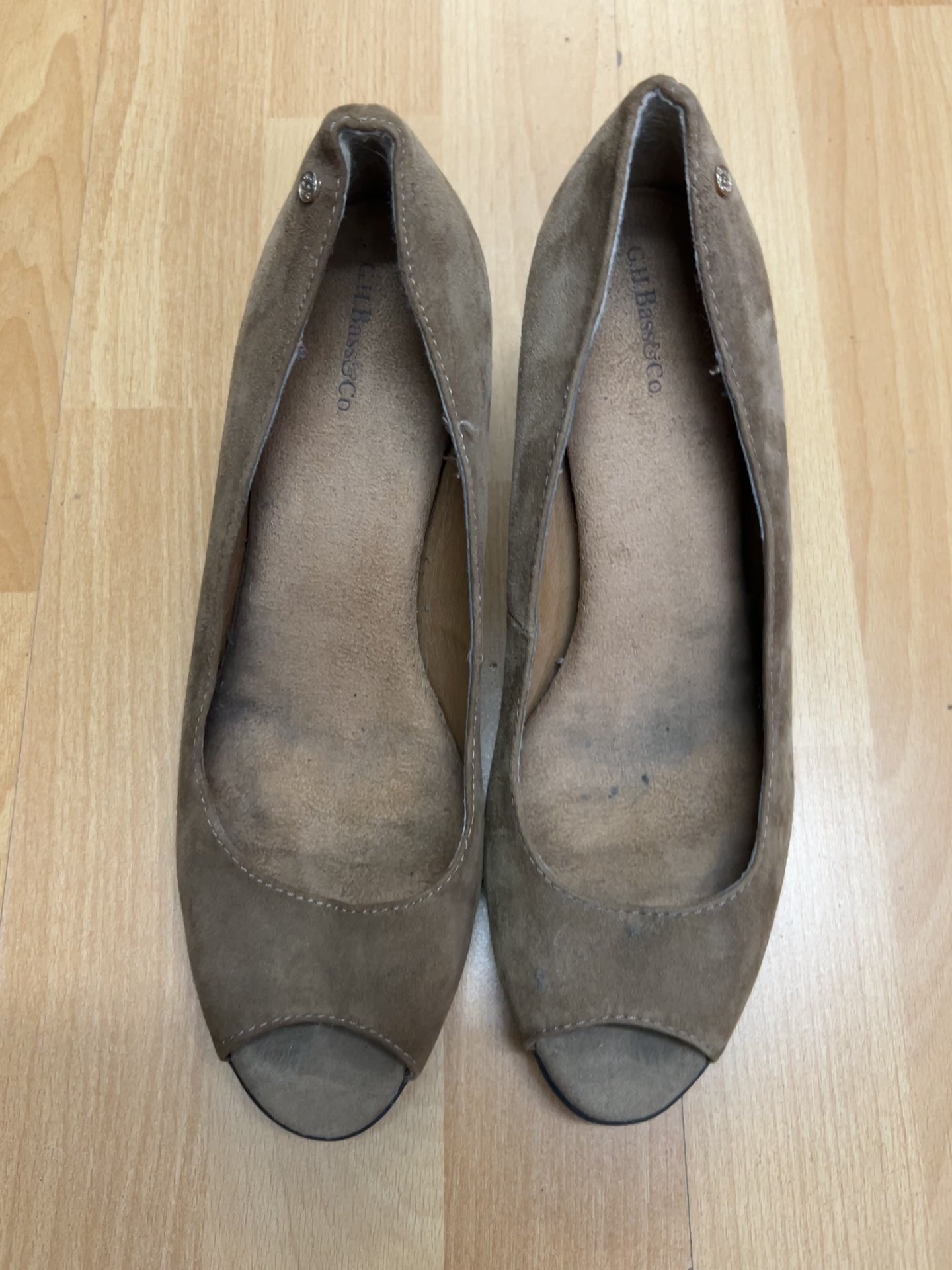 Escarpins Bass & Co. en suède brun avec bout ouvert et petit talon.